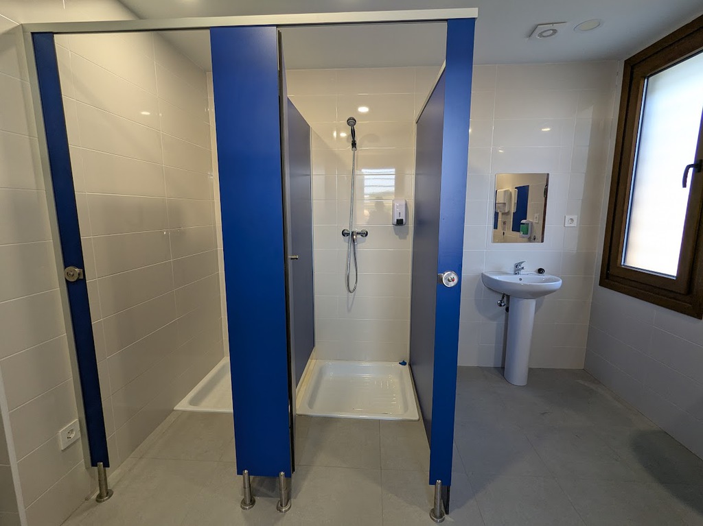 Baño privado tipo camping, equipado con 3 lavabos, 2 duchas individuales y 2 cabinas con inodoro. Dispone de dispensadores de jabón de manos y gel-champú.